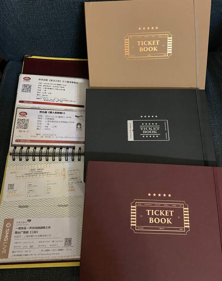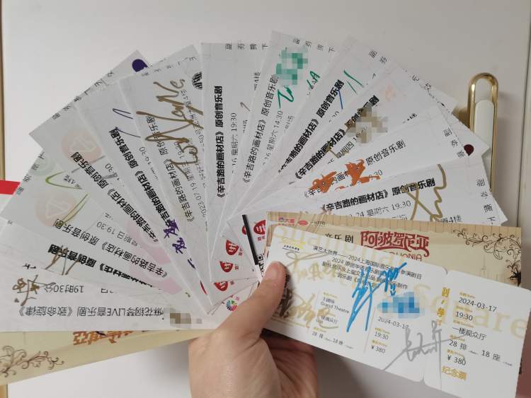 去年(2023)一年,昵称“今年要节约”的一位剧迷共计看过169场演出,消费58900元,其中音乐剧占比最高,超过100场——常年有剧场观演习惯的观众大多会有收藏演出票根的习惯,其中一些票根上还会有大家在SD(Staff Door,演职人员通道)时特地要来的签名。早年间就有看话剧的习惯、“入坑”音乐剧五年多,她的票夹已经用完了五本,积累了四五百张演出票,最近刚刚启用第六本。