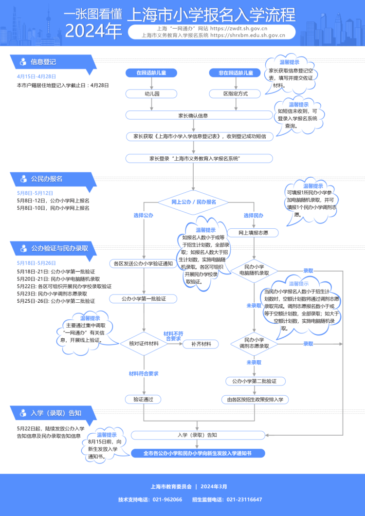 据悉,4月7日,各区将公布义务教育学校招生工作实施方案和招生细则。4月15日前,各区将组织幼儿园大班家长会和小学毕业班家长会,具体解读今年义务教育招生政策。