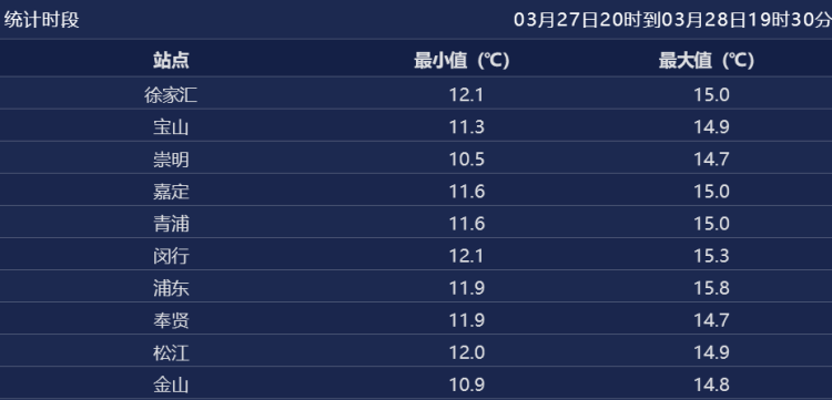 今天白天多云到阴为主,云系较多,加上冷空气扩散,气温回升很有限,徐家汇站最低气温12.1℃,最高气温14.8℃。