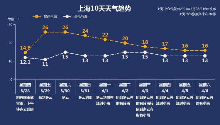 上海中心气象台预计,明天以晴到多云为主,阳光回归,气温冲高,预计最高气温可以达到26℃,有些初夏的意味;但早晚气温仍在低位,仅有11℃,昼夜温差达15℃。