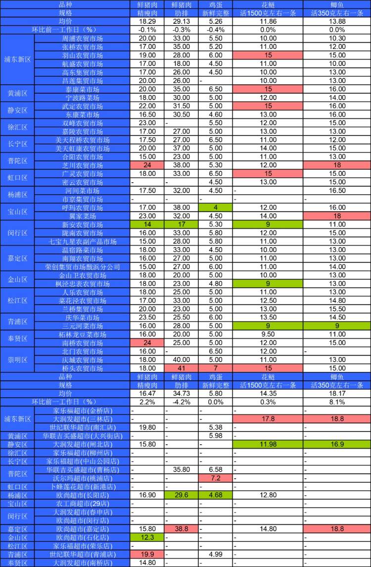 ■粉底标注代表该肉蛋鱼品种在上述农贸市场或超市的最高价;绿底标注代表该肉蛋鱼品种在上述农贸市场或超市的最低价