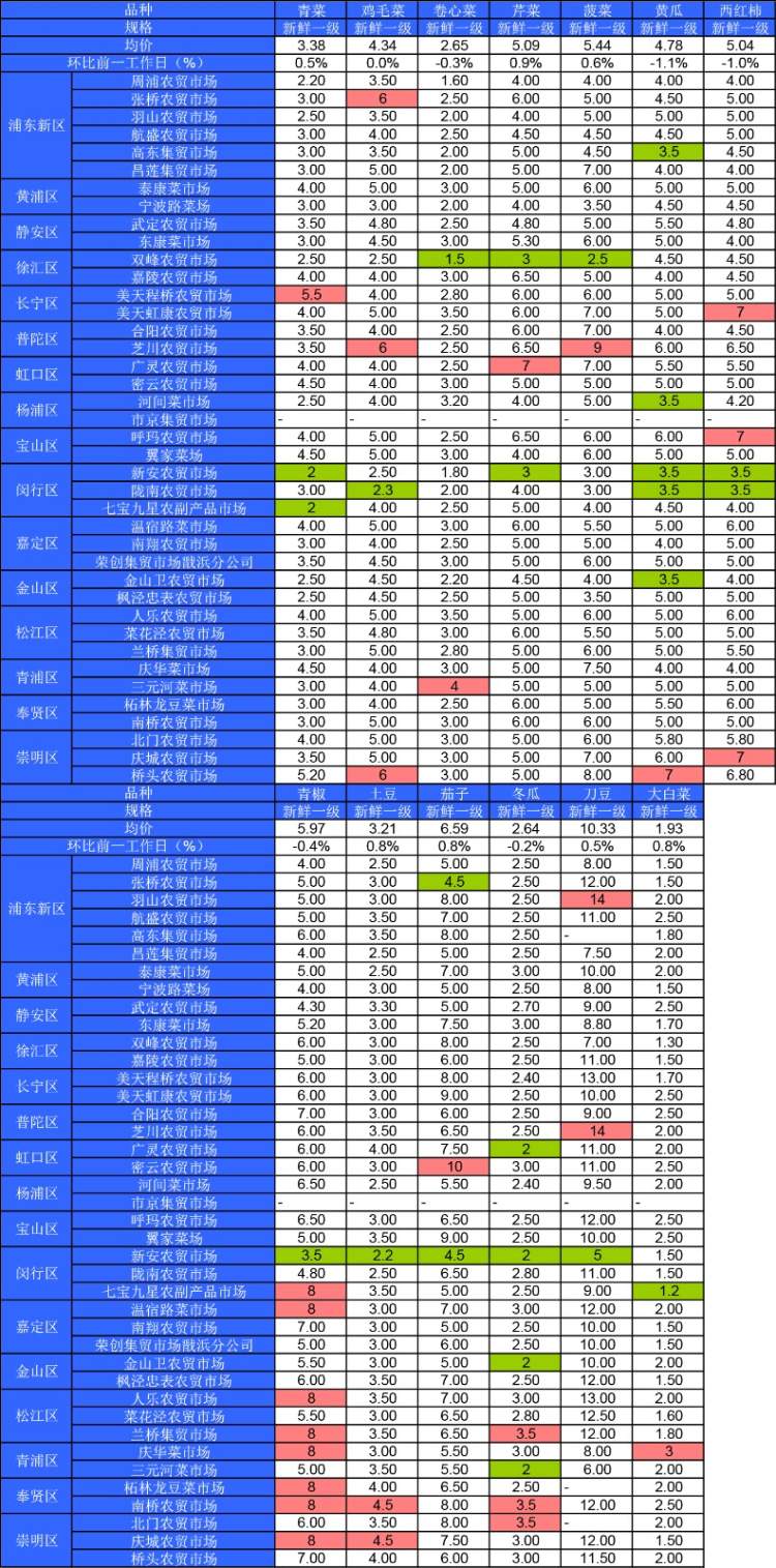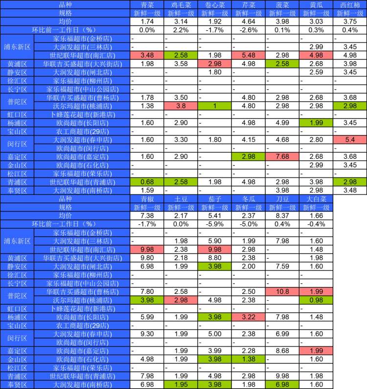■粉底标注代表该蔬菜品种在上述农贸市场或超市的最高价;绿底标注代表该蔬菜品种在上述农贸市场或超市的最低价