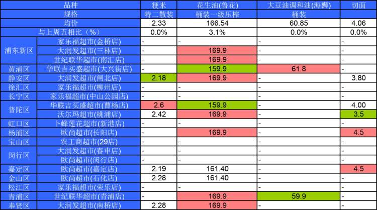 ■粉底标注代表该粮油品种在上述超市的最高价;绿底标注代表该粮油品种在上述超市的最低价