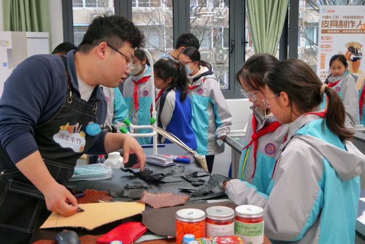 活动中,周大山向学生展示鳄鱼皮、鸵鸟皮、山羊皮等多种大牌包常用质皮,讲述了手工皮艺的悠久历史。他详细讲解了爱马仕针法这一高级皮艺技法,以及皮具压制等精细工艺,青少年听得津津有味,纷纷表示对皮艺制作产生了浓厚兴趣。