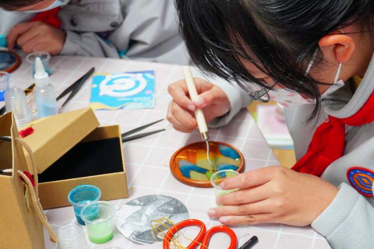 掐丝定型后的点蓝环节,青少年更是充分发挥创意,用点蓝刀绘出个性十足、意趣横生的图案:蓝色渐变的山川、梦幻紫海豚、红黄相间的太阳……