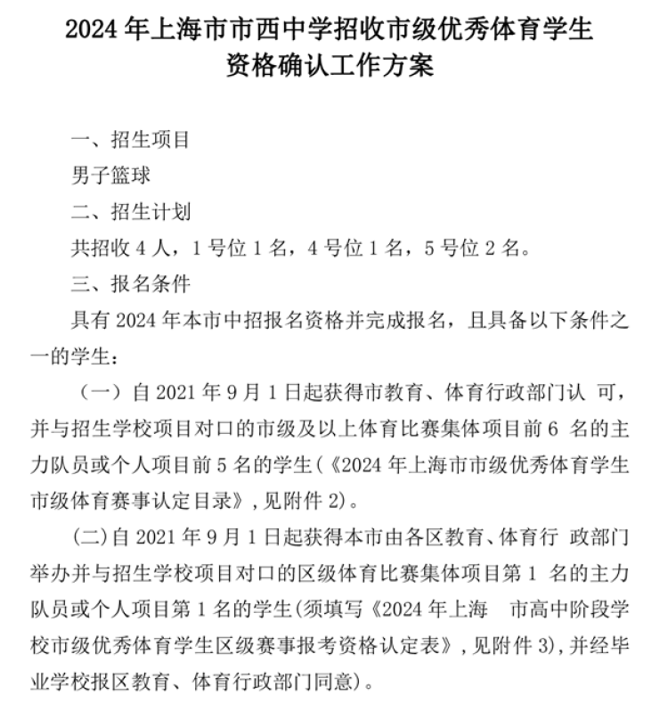2024年上海市中国中学招收区级优秀体育学生资格确认工作方案