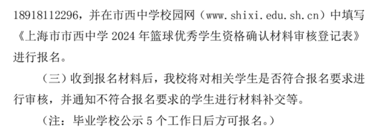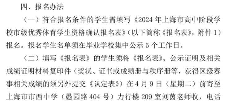 (一)符合报名条件的学生可填写《2024年上海市高中阶段学校区级优秀体育学生资格确认报名表》(以下简称《报名表》)报名。报名学生名单须在毕业学校集中公示5个工作日(2024年4月7日–11日)。