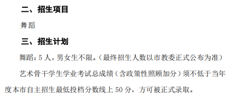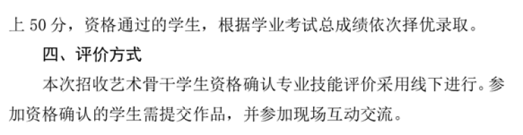艺术骨干学生学业考试总成绩(含政策性照顾加分)须不低于当年度本市自主招生最低投档控制分数线,方可被正式录取。达到控分线的学生依照艺术骨干学生资格确认综合评价成绩排序,择优预录取。