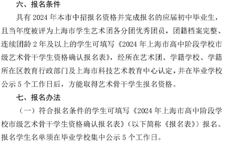具有2024年本市中招报名资格并完成报名的应届初中毕业生,且当年度被评为上海市学生艺术团各分团优秀团员,团籍档案完整、连续团龄2年及以上的学生可填写《2024年上海市高中阶段学校市级艺术骨干学生资格确认报名表》,经所在艺术团、学籍学校、学籍所在区教育行政部门及上海市科技艺术教育中心认定后,并在毕业学校网站公示5个工作日后,方能取得艺术骨干学生报名资格。
