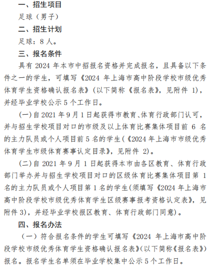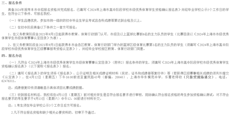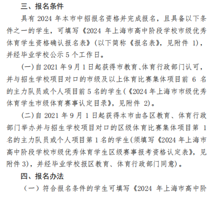 具有2024年本区中招报名资格并完成报名,且具备以下条件之一的学生,可填写《2024年上海市高中阶段学校区级优秀体育学生资格确认报名表》,并经毕业学校公示5个工作日(2024年4月7日–11日)。