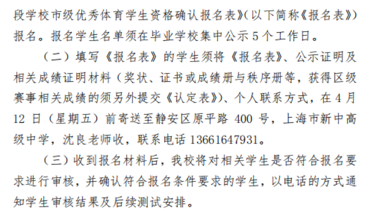 (二)填写《报名表》的学生须将《报名表》一式六份、教练推荐函、运动经历介绍、相关比赛的秩序册和成绩册复印件等佐证材料,材料充分。获得区级赛事相关成绩的须另外提交《认定表》),一并于2024年4月12日(12:00)(星期五)前递送到市北中学,封面注明优秀体育学生招生材料,收件人:校务办公室 张琛。