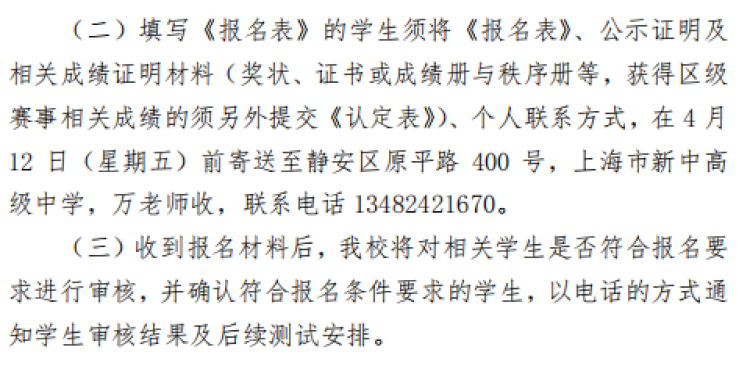 (二)通过公示的学生须将《报名表》(须学校盖章)、公示证明原件及相关成绩证明材料(奖状复印件、成绩册与秩序册复印件等,获得区级赛事相关成绩的需另外提交《认定表》),在4月9日前寄至宝山区泰和路99号,张佳莹收,电话:13585739281 (以邮戳时间为准)。