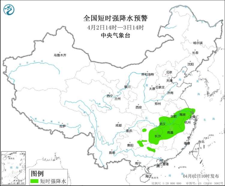 预计4月2日14时至3日14时,安徽南部、江苏南部、上海、湖北东南部、湖南中东部、江西中北部、浙江西部、广西东北部等地的部分地区将有8-10级雷暴大风或冰雹天气,局地风力可达11级以上,冰雹直径可达2厘米;安徽南部、江苏南部、上海、湖北东部、湖南中东部、江西中北部、浙江西部、贵州东南部、广西东北部等地的部分地区将有短时强降水天气,最大小时雨量30-50毫米,局地可达70毫米以上。