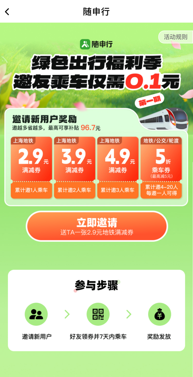 邀好友绿色出行仅需0.1元起,市民可打开“随申行”APP/小程序,在“热门活动”进入【绿色出行福利季】参与活动,点击“立即邀请”将活动页分享给好友共同参与绿色出行。好友完成“随申行”注册后即可获得1张2.9元地铁乘车满减券。好友完成一次绿色出行后,邀请人也可获得公共交通优惠券,一同享受最低0.1元乘车福利,至高可享96.7元的出行补贴。