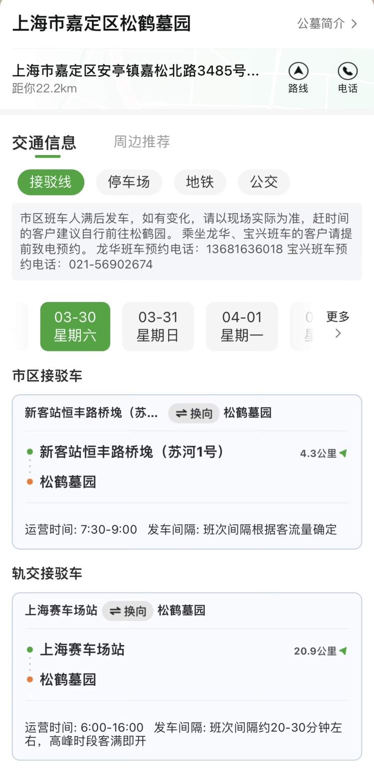 市民可以在“祭扫通”专区内搜索“松鹤墓园”,进入墓园详情页,一键查询前往墓园的公共交通方式,包含指定日期市区、轨交往返的扫墓接驳线;点击“周边推荐”,选择想要去的景点如“嘉北郊野公园”,MaaS智能行程规划将会优先推荐从当前位置前往目的地的绿色出行方式。