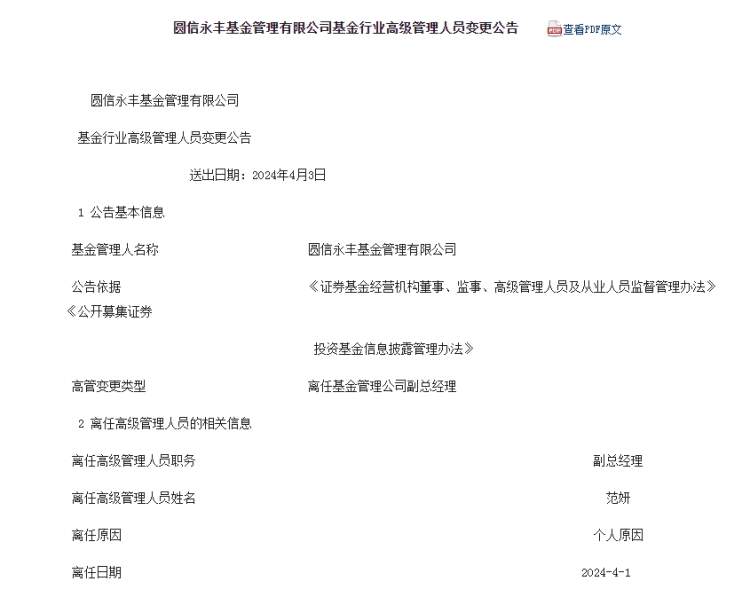 就在今天,圆信永丰基金发布公告显示,因为个人职业发展,公司副总经理范妍离任,同时卸任其所掌管的所有基金的基金经理职务。