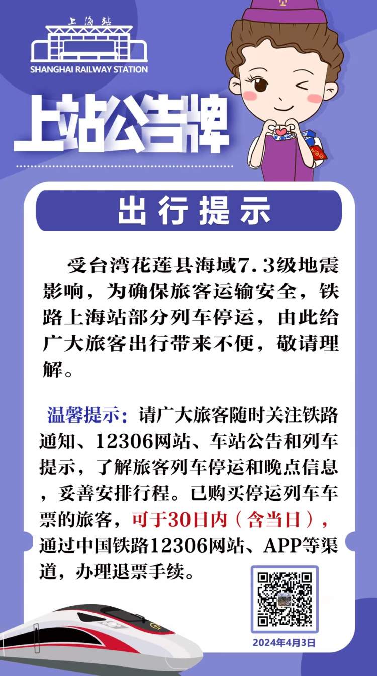 受地震影响,上海目前15趟列车停运,部分列车晚点,铁路局否认“大面积晚点” 郁文艳 2024-4-03 来源:周到上海 记者从铁路上海站获悉,受台湾花莲地震影响,为确保旅客运输安全,决定停运部分列车。目前,停运的有15趟列车。此外,受地震影响,部分列车晚点。 铁路部门表示,已购买停运列车车次的乘客可以免费办理退票手续。目前,这些旅客应该已经收到12306发送的信息提示。 除上海外,杭州东站等站点也出现列车晚点的情况。不过,中国铁路上海局集团有限公司相关人士向记者表示,目前没有出现“大面积晚点“的情况。 来源:周到上海 作者:郁文艳 赞一个 (0)