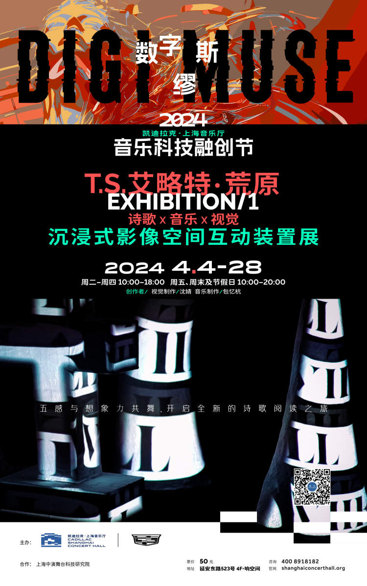 “数字缪斯——2024音乐科技融创节”T.S.艾略特·荒原——诗歌 X ⾳乐 X 视觉 沉浸式影像空间互动装置展将在上海音乐厅4楼·响空间将于4月4日正式开启,为期以“寻找诗歌阅读新形式”为出发点,通过“视觉诗”“空间影像”“互动装置”3个领域进⾏了⼀系列的研究创作。“读诗”不仅仅是阅读⽂字,它更是⼀种多种感官相互作⽤下的⾏为⽅式,可以聆听、触摸和体验,带领观众通过沉浸式影像空间,感受诗歌的⽆穷魅⼒。