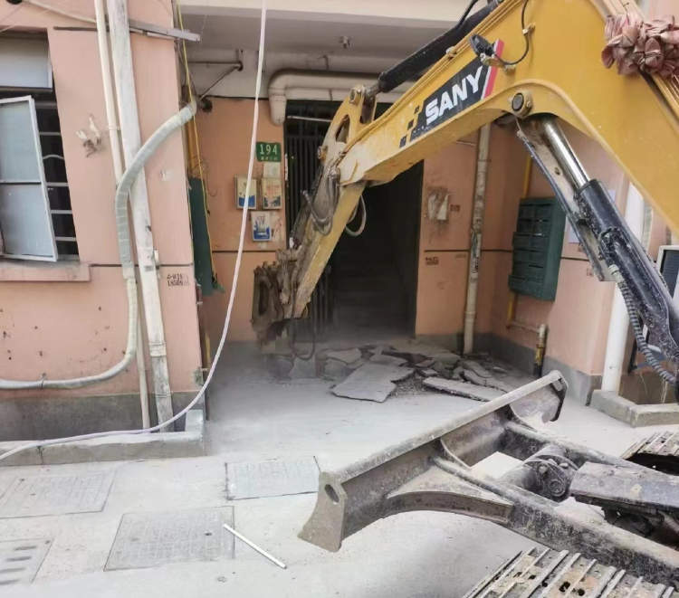 在挖土机的轰鸣声中,通河六村和田小区150号加梯工程正式开工,同时,小区142号电梯完成交付手续——至此,和田小区全部实现加梯全覆盖,成为宝山区首个既有多层住宅加装电梯全覆盖小区。