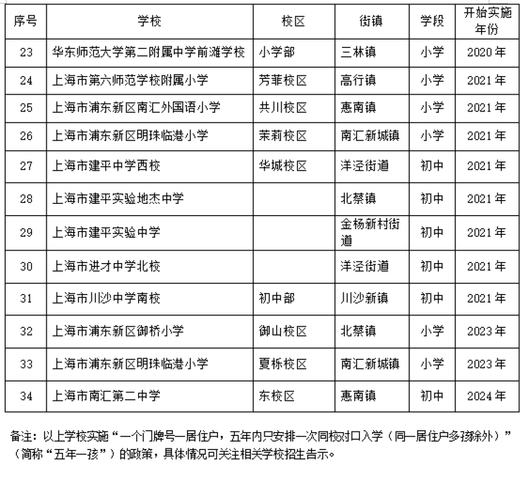 今年浦东新增一所实行“五年一户”的学校:上海市南汇第二中学(东校区),现在,浦东新区共有34所学校实行“五年一户”政策。