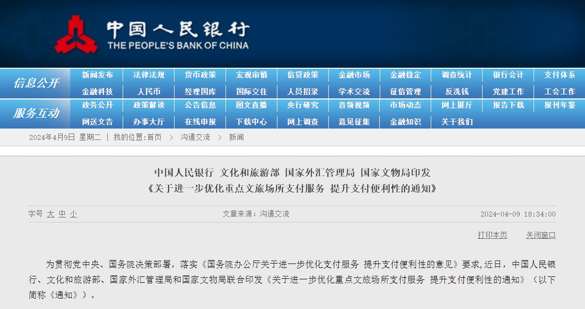 4月9日,据中国人民银行网站消息,中国人民银行、文化和旅游部、国家外汇管理局、国家文物局联合印发《关于进一步优化重点文旅场所支付服务提升支付便利性的通知》。