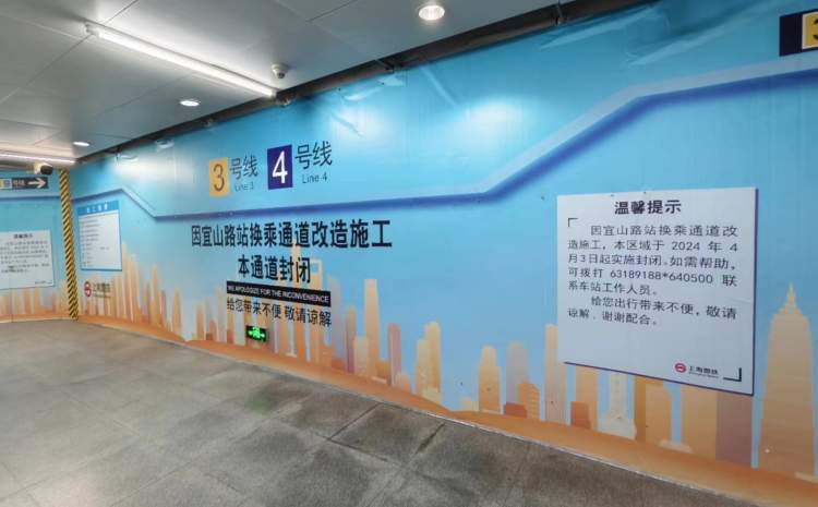 目前,原先的大部分换乘通道已经封闭,走近时可以听到里面传来施工的声音。施工铭牌上的信息显示,工程名称为“上海市轨道交通9号线一期工程宜山路站换乘通道装饰装修及机电安装工程”,开工日期为4月3日。