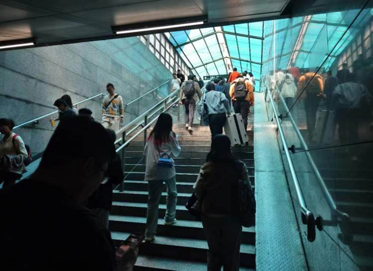 乘坐自动扶梯上楼后,旁边又传来语音提示“换乘9号线的乘客们请注意,不要在此下楼,根据导向指引,前往换乘通道”。