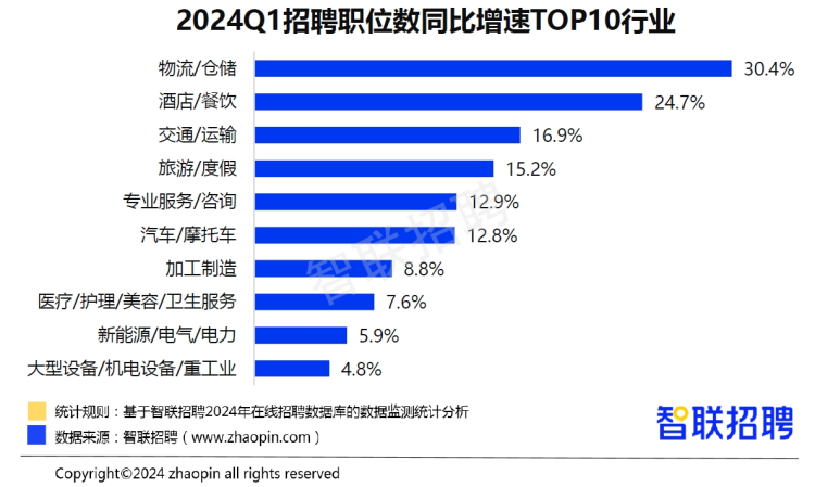 与之相对应的则是智联招聘的数据显示,一季度,物流/仓储、酒店/餐饮、交通/运输、旅游/度假等服务消费相关行业招聘职位数同比增速分别为30.4%、24.7%、16.9%、15.2%,位列各行业前四。