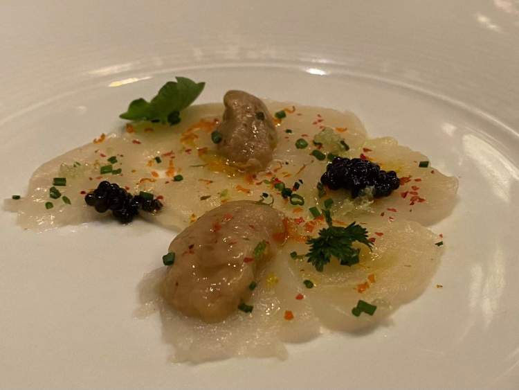开胃菜以扇贝、海胆和鱼子酱为特色,如楔子一般引领着人们踏上一段味觉之旅,代表海洋元素的贝类食材清香鲜甜,酱汁绵密,口感丰盈,宛如普利亚的海风轻拂,温柔地拉开序幕。