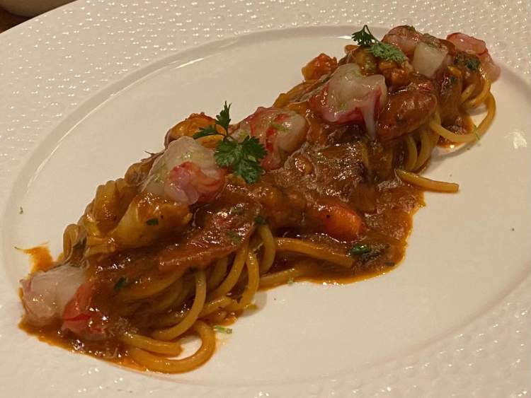 接着的登场的意大利面展现了更为强烈的普利亚风味,生熟红虾佐以浓郁的海鲜酱汁,丰富的层次在口腔中层层荡开,渲染着来自地中海的气息。