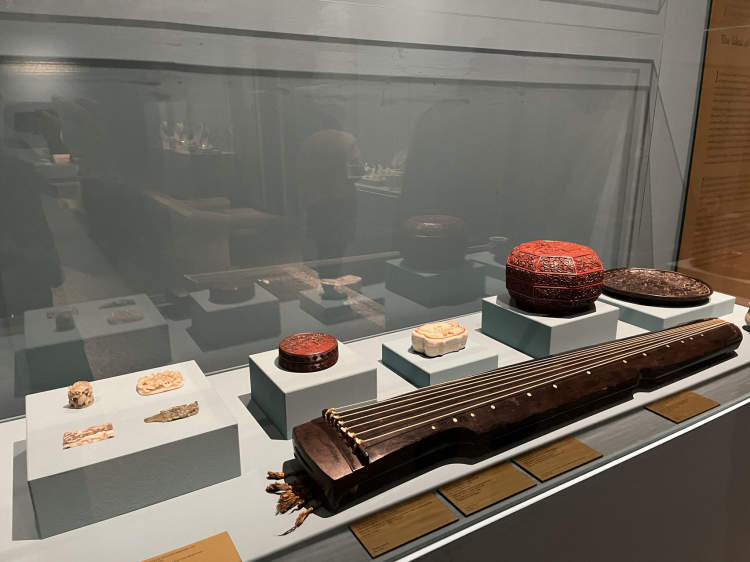 上海博物馆作为此次展览的联合主办单位,遴选48件/组文物,与上海市历史博物馆(上海革命历史博物馆)出借的1件/组展品,共同构成展览中的中国篇章。来自中国的文物涵盖陶瓷、漆器、丝织品、金银器、玉器、印章、钱币等多个门类,重点展品包括元景德镇窑卵白釉加彩梵文碗、元景德镇青花缠枝牡丹纹瓶、剔红东篱采菊圆盒、至大通宝、成吉思汗金币等。