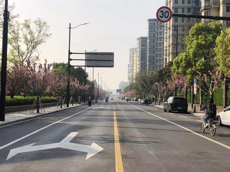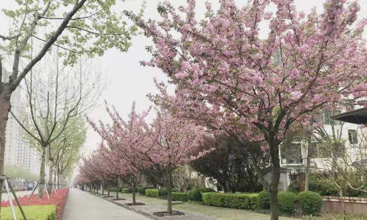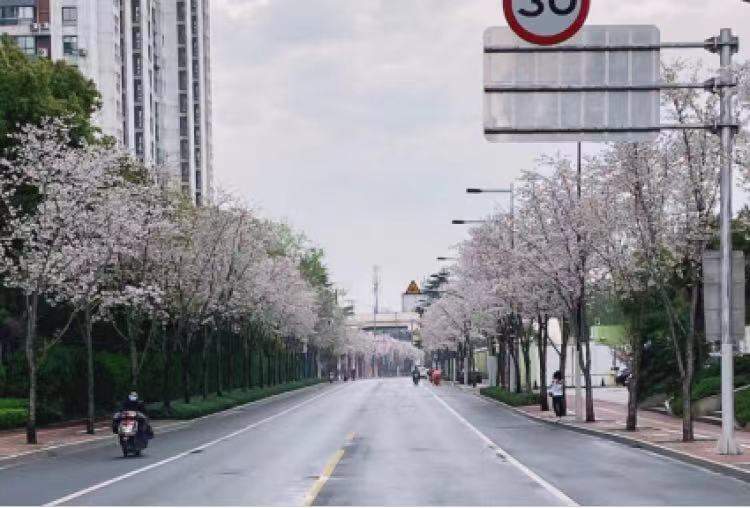 除了这条种植晚樱的道路,宝山区大场镇经地路也以晚樱为行道树,这几天正是盛花时节。