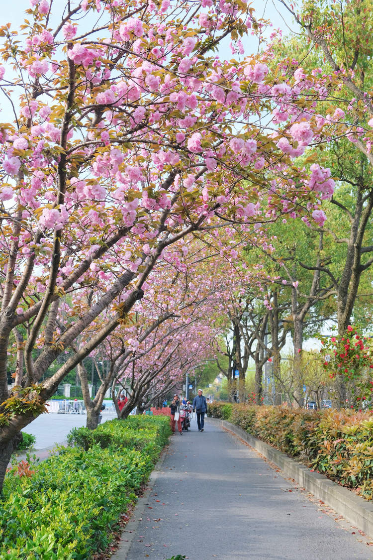 江湾城路(殷行路-清波路)的一侧种植了品种为关山的晚樱,另一侧种植香樟,一边是满树的粉色,一边是满树的翠绿,每年4月清明过后的一周,是这条路最美的时刻。