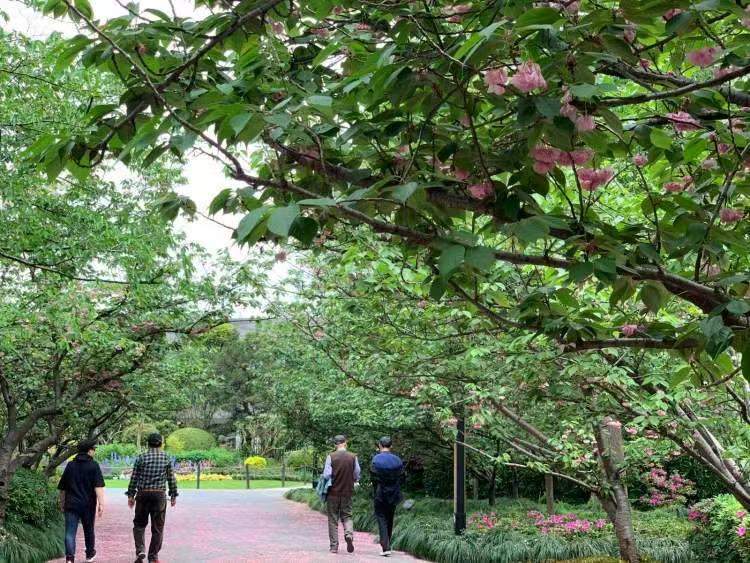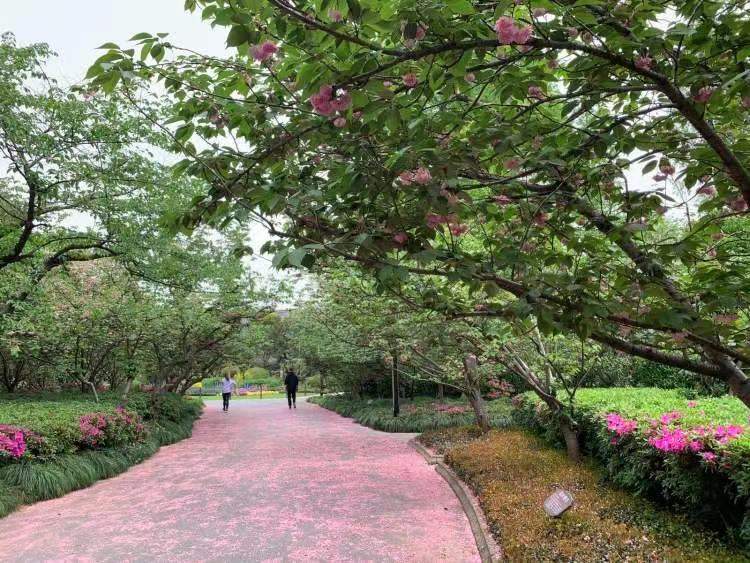去年4月18日起,这条道路再次开启“落樱不扫”。同时,杨浦公园内一条晚樱道路也首次加入,铺成了一条粉色花毯。