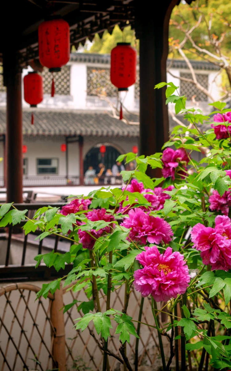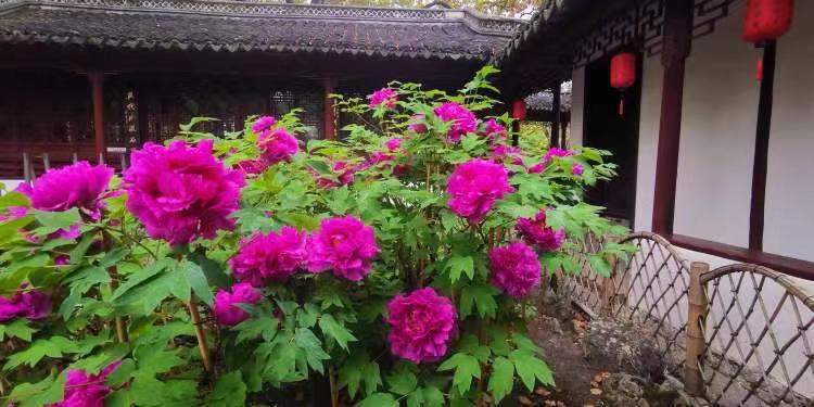 古猗园内的古牡丹位于曲香廊,已经开了23朵花,还有3个花骨朵含苞待放,所以,今年总共可以开26朵花。赏花之余,古色古香的亭台楼阁是市民游客歇息的好去处,同时也是“别有一番景象”的最佳拍照点。