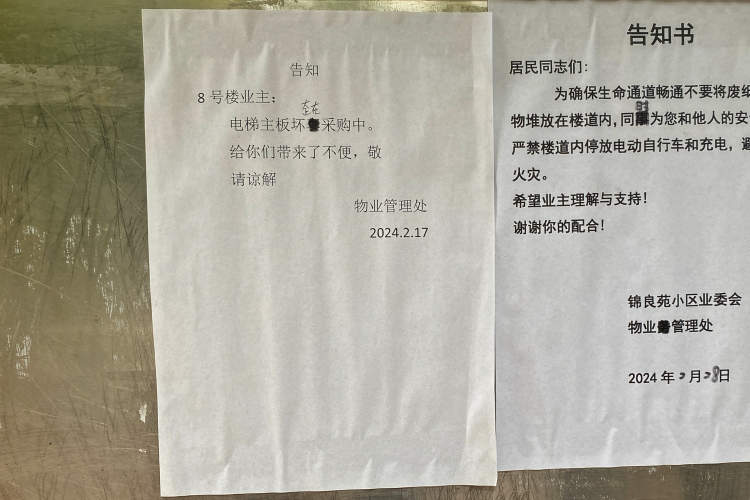 记者了解到,电梯这次是2月16日坏掉的。单元楼门上贴着2月17日的告示,说电梯的电脑主板正在采购中。