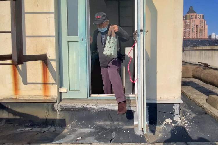 ▲老人艰难的跨过横在顶楼的大管道
