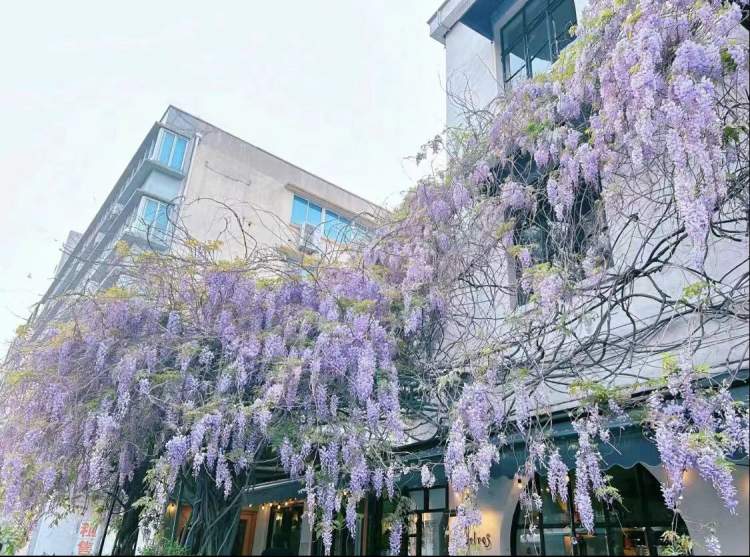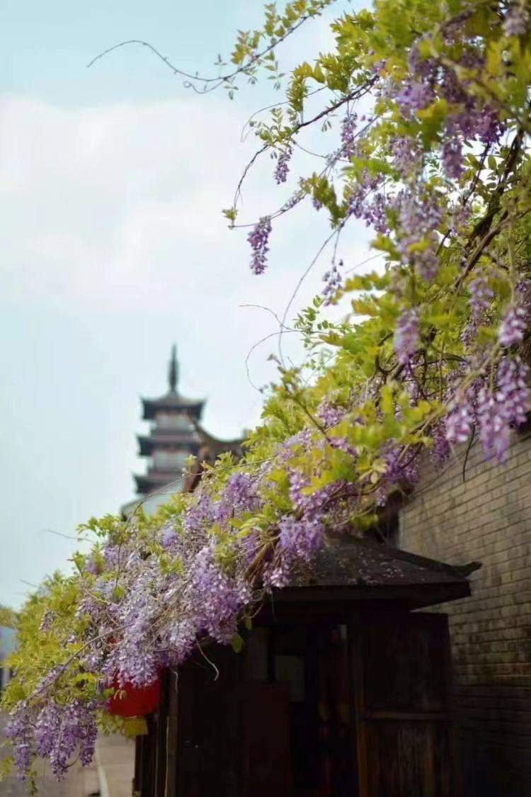 州桥老街法华塔一侧有一株百岁紫藤,层层叠叠的紫藤攀附在屋檐上,非常出片。