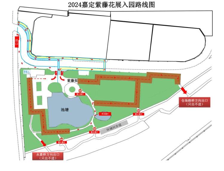封闭式管理是指,在公园南侧靠近嘉定环城河区域增设绿网,游客主出入口设置在公园北门口,东侧作为游客统一入口,西侧作为游客出口,公园内形成顺时针方向的单向赏花游园线路,避免人流对冲。同时,为方便游客游园后直接进入环城河步道,在公园东南角和西南角分别设置游客次出口(只出不进)。