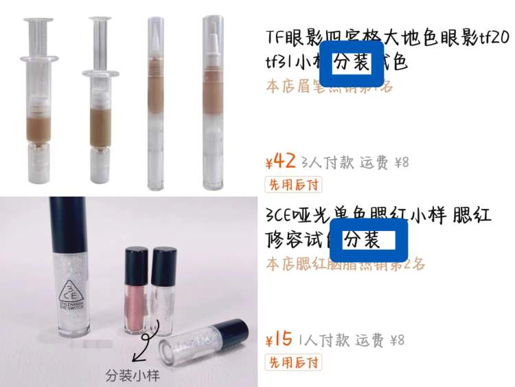 尽管如此,记者发现,仍有少数消费者“上头”分装化妆品,在“口口流传”间分享一些隐蔽的店铺。而这些店铺点进去,除了常见被分装的遮瑕膏、粉饼等内容外,还有用针管、小瓶分装乳液、闪片等行为,有些甚至直接在标题上挂有“分装”二字,显得有恃无恐。