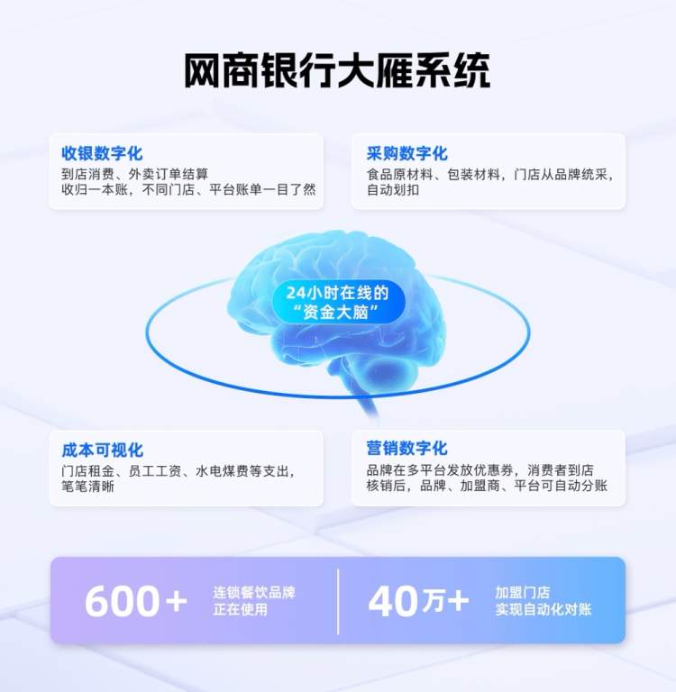 据了解,升级后的大雁系统相当于一个7×24小时运转的“资金大脑”,可以为连锁加盟品牌提供从收银、支付结算到多平台经营的全链路数字化,助品牌降本提效。