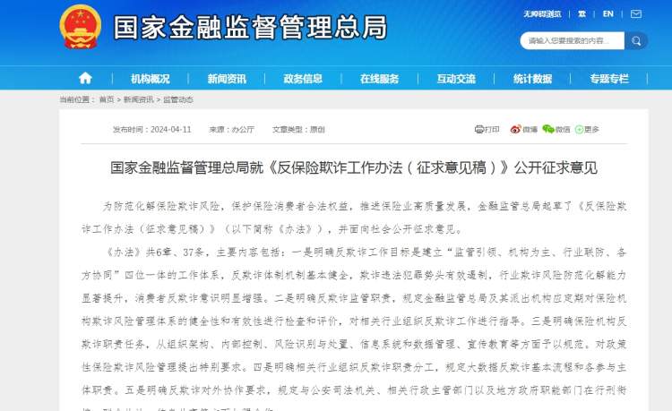 对保险欺诈坚决打击!4月11日,金融监管总局下发《反保险欺诈工作办法(征求意见稿)》,并面向社会公开征求意见。下一步,金融监管总局将根据公开征求意见情况,进一步修改完善《办法》并适时发布实施。