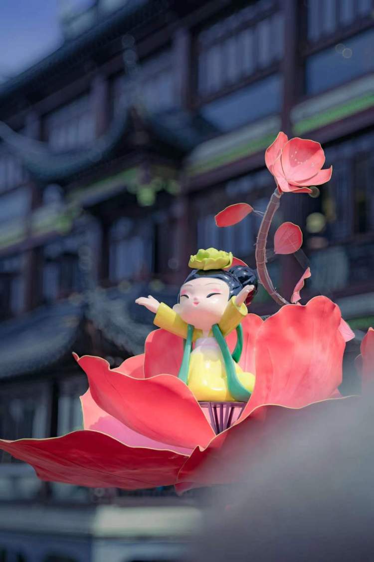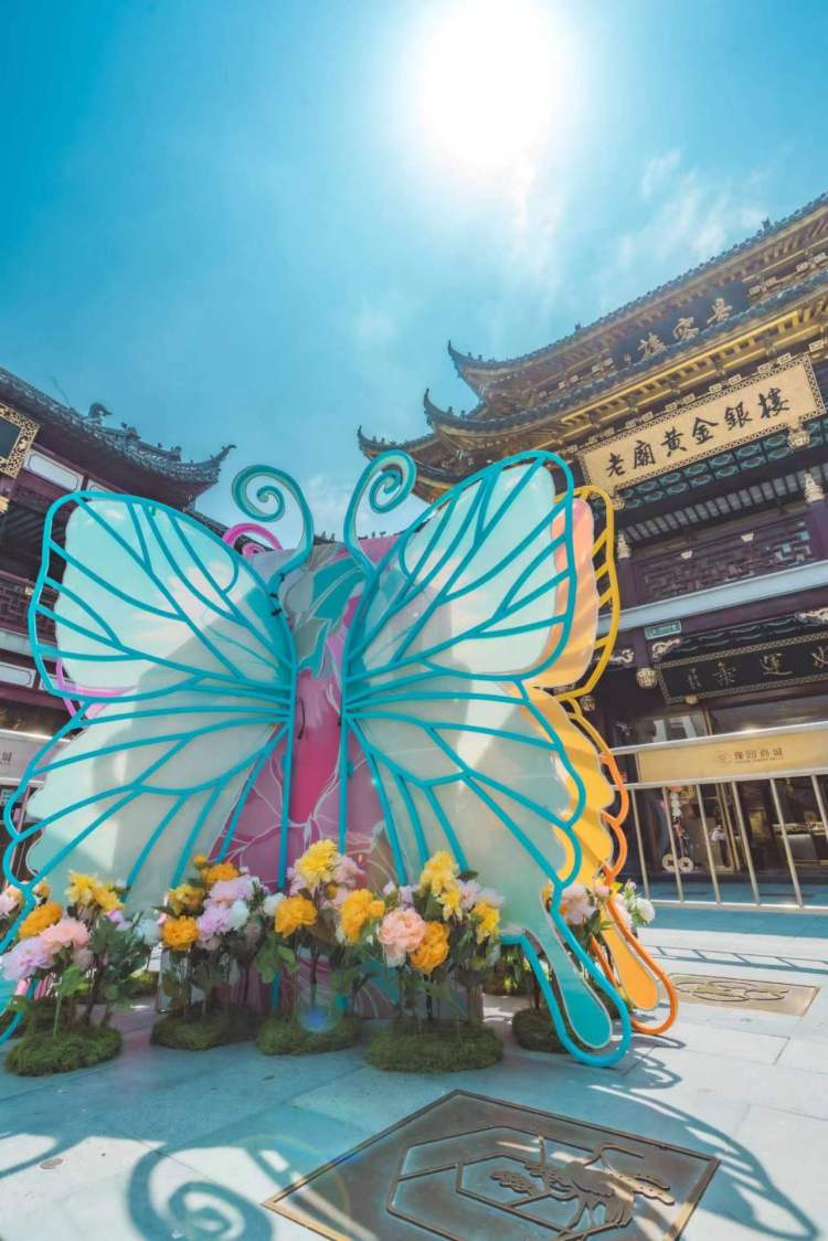 今年的豫园花朝节,百年九曲湖心开出巨型牡丹花、华宝楼前还原花朝游艺场、黄金广场妆点蝴蝶花语墙,豫园三大核心区域呈现出“福豫花海”“百花福地”“踏春寻蝶”的不同主题,串联起丰富的感官互动体验路线,彰显花朝盛世的东方美学之境。