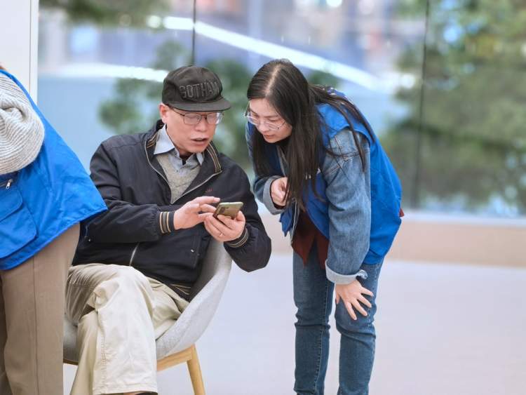 4月12日,由新闻晨报·周到和蓝马甲联合组织的“智能手机课堂”走进华为智能生活馆·上海大宁国际店,手把手指导老年人如何更丝滑地使用手机。