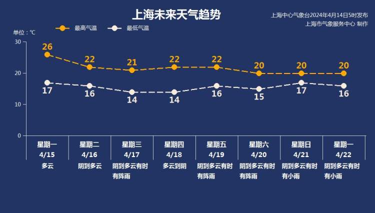 下周前半段以多云或阴天为主,雨水“快闪”。其中周一阳光最好,气温也是近期最高的一天,在17~26℃之间,适宜洗晒。下周后半段还有冷空气影响,配合降水,使得我国多地气温出现下降。不过影响上海的力度不大,下周气温总体平稳;但19日起阳光隐匿,雨水将再度频繁起来。