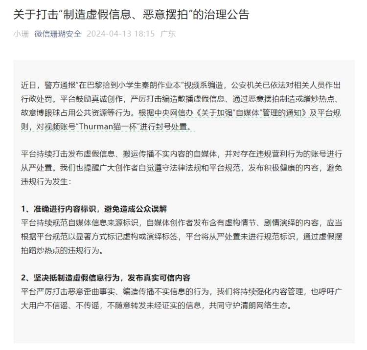 近日,警方通报“在巴黎拾到小学生秦朗作业本”视频系编造,公安机关已依法对相关人员作出行政处罚。平台鼓励真诚创作,严厉打击编造散播虚假信息、通过恶意摆拍制造或蹭炒热点、故意博眼球占用公共资源等行为。根据中央网信办《关于加强“自媒体”管理的通知》及平台规则,对视频账号“Thurman猫一杯”进行封号处置。