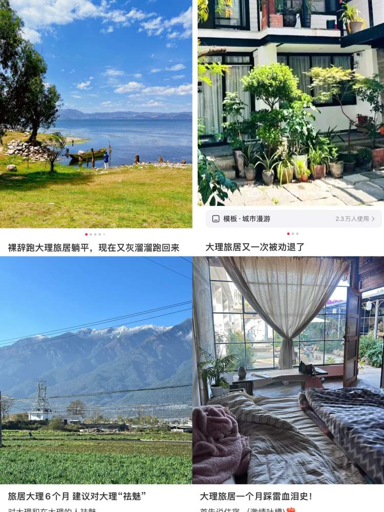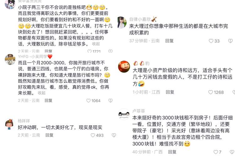 在各类平台上,大理都是旅居地的热门选择。但是实际的体验效果看来属于毁誉参半,和“富贵花花”同样感受的人不在少数,大家给出的普遍旅居反馈就是“贵”以及“不方便”。