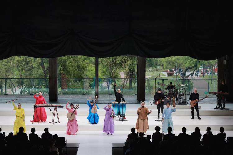 演出突破传统镜框式舞台,根据场地特点,展示出舞台背后的玻璃幕墙。夜色下玻璃镜面反射出演奏家和观众们共享国乐的身影,而在午后窗外绿树掩映生机盎然,别有一番生活情趣。“机智的”海派民乐结合上海城市昼夜各异的浦江美景,呈现独具匠心的新意与巧思。