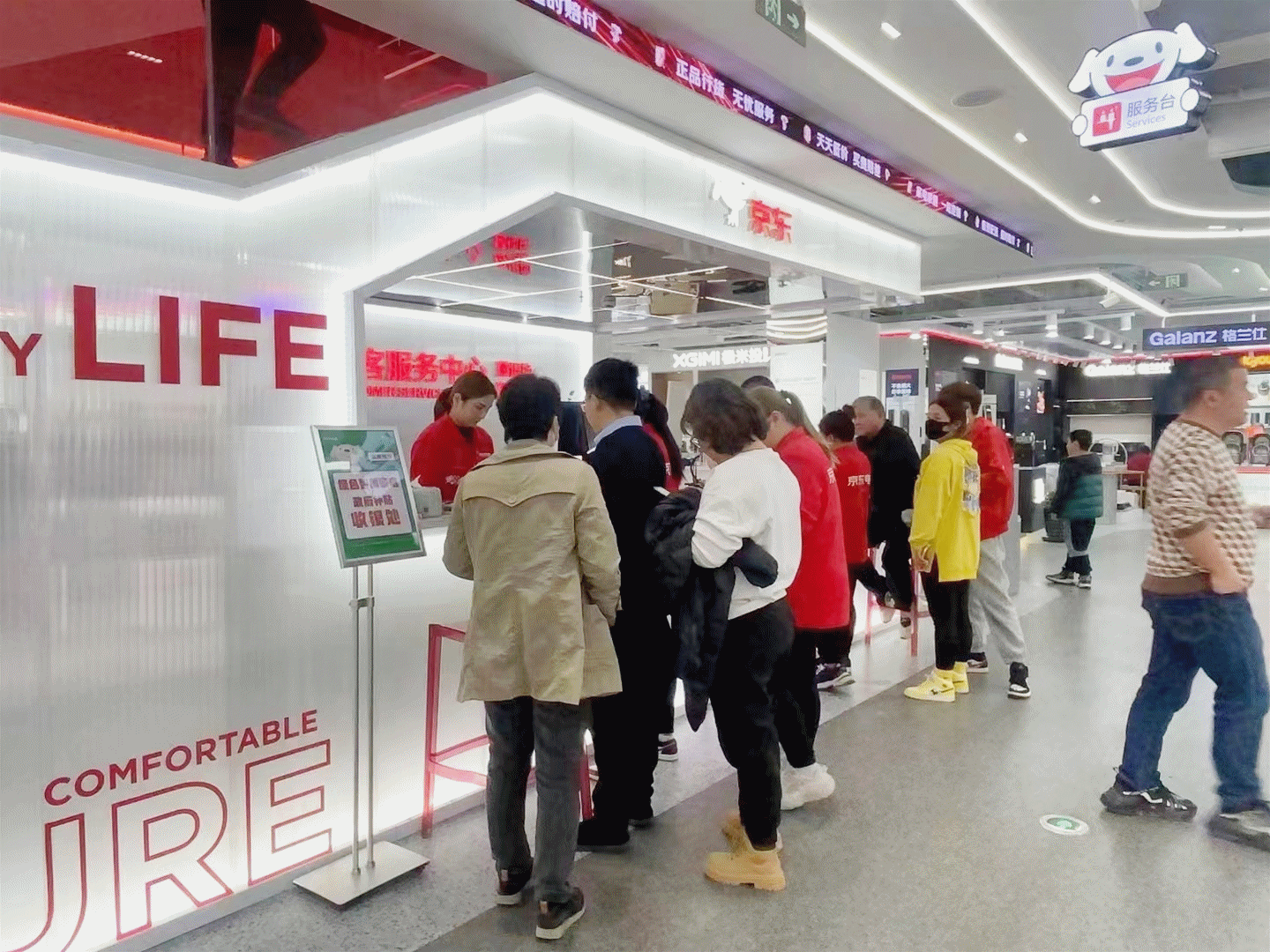 另一边,位于龙之梦城市生活中心的京东电器城市旗舰店同样迎来了大波客流。店内处处张贴着财政补贴相关海报,让消费者一目了然,工作人员也会主动为消费者介绍此次活动,不错失这次家电换新的好机会。