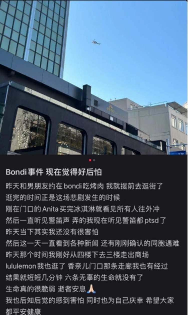 这个名为Bondi的大型购物中心也是当地中国留学生和华人最爱光顾的地方之一。经中国驻澳大利亚大使馆、中国驻悉尼总领馆证实,有一名中国留学生不幸遇难,另一名中国留学生受伤。